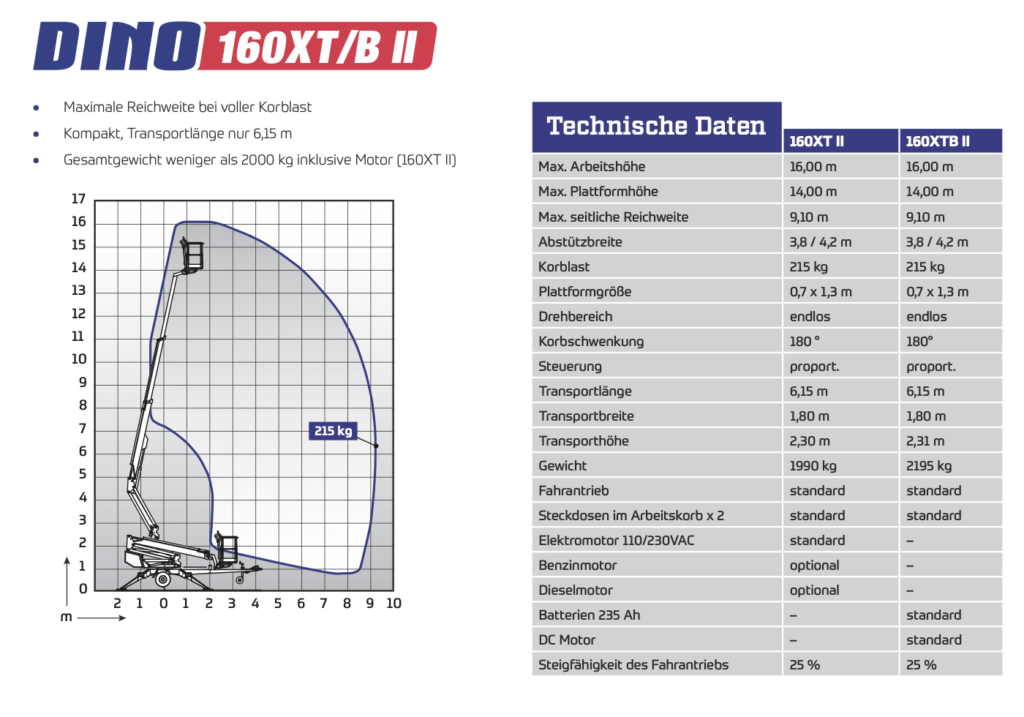 Die Maschine überzeugt durch ihre geringe Transportlänge von nur 6,15 m sowie ein Gesamtgewicht unter 2000 kg (Modell 160XT II), was den Transport besonders einfach macht.